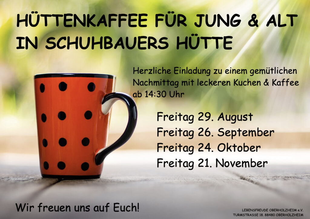 Es findet wieder regelmäßig einmal pro Monat unser Hüttenkaffee statt. Ab 14:30 Uhr ist jeder eingeladen, einen gemütlichen Nachmittag bei Kaffee & Kuchen in unserer Hütte zu verbringen. Gerne weitersagen! Nächster Termin für unseren Hüttenkaffee: